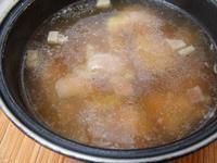加入开水和一勺料酒,上锅蒸两个半小时,具体时间以肉皮软烂度为准。蒸的方式可以有效的减少脂肪和蛋白质乳化在汤汁中的作用,使得成品更加透明好看。