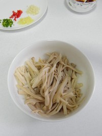 杏鲍菇出锅后,稍微放一会,放至不烫手,然后将杏鲍菇撕成粗细差不多的条