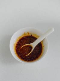 利用蒸制杏鲍菇的时间,芝麻酱加上适量的温水拌匀(用勺子舀起后,芝麻酱呈直线状缓慢而连续的下落),再加上生抽、醋、白糖、辣椒油和盐拌匀调成酱汁