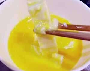 裹一层鸡蛋液,有条件的可再裹一层面包糠,外酥里嫩。因为家里没有买面包糠,所以直接仅裹了一层鸡蛋液。