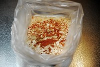 把面粉,盐,辣椒粉,五香粉都倒进保鲜袋里,扎口摇晃均匀。