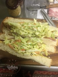 最后,把抹芥末的那片盖在卷心菜上,切开就大功告成~ 因为卷心菜很散,最好用纸围以下比较整齐。 这个三明治特点是要多多卷心菜,可以加牛油果,番茄,反正根据自己的喜好