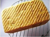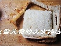 做好的土司放凉,一个小时后,切片。(土司做法:土司材料除黄油,和橙皮外,揉至光滑,加入黄油后揉至大片薄膜,然后加入橙皮丁,混合均匀后,发酵至两倍大。取出分成三份,滚圆。静置20分钟。然后再整形放入模具中,再次发酵至八成满,盖盖,放预热到190度的烤箱,烤35分钟即可。)