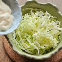 将高丽菜叶洗干净后沥干水后切丝,然后拌入适量的蛋黄酱