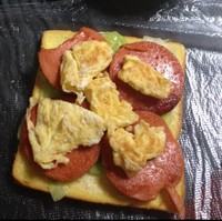 开始咯~一块面包涂沙拉酱~再放菜然后放肠再放鸡蛋~再放一块涂好沙拉酱的面包!