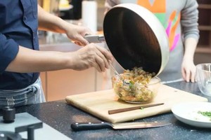 【4】煎食材 在锅里倒入一点橄榄油,将调味后的圆鳕和虾放到锅里煎到酥脆。