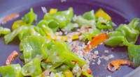 青椒、彩椒切块,用少许白糖、生抽、料酒调味,放锅里炒一下,最后放少许鲣鱼花(即柴鱼片)。