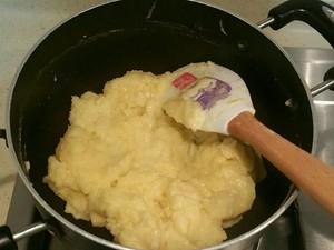 小火锅里放黄油 倒入奶酪糊不断翻炒 防止粘锅