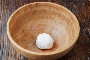 100g糯米粉中逐步加入60g温水,边加温水边用筷子搅拌,直至凝结成一个个小块后,用手揉成一个面团。