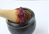每次取适量的玫瑰花瓣放入蒜罐中(一定要刷干净没有蒜味,用盆子和擀面杖也可以),再放入一勺白糖