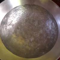 从面团揪出一小团,拍圆按扁,大小跟手掌差不多
