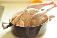 腌制好的湿漉漉的火鸡坐在锅里沥去水分风干表皮。