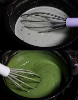加入牛奶和香草精,一边不停搅拌一边用中小火加热,待整体变粘稠了,火候改为小火。