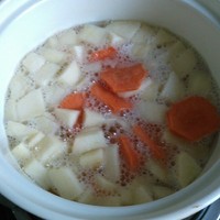胡萝卜去皮切块。苹果去皮去核切块,砂锅加水加切好的块一起煮开