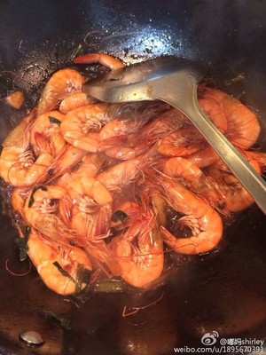 调到中火翻炒至虾完全变色,加入适量白糖、生抽和少许清水。因为要加老抽上色,所以生抽不能倒太多,要比正常量少一些。