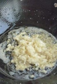 炒锅中放入一勺花生油,小火,再放入剩下的一半蒜泥