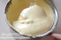 将以上所需材料依次称量好(注意鸡蛋要求室温),然后将黄油用直火或微波炉彻底溶化成液体,再倒入牛奶,混合均匀备用;