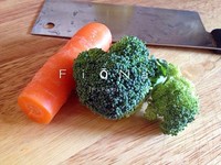 西兰花在盐水里浸泡10分钟,洗净。 胡萝卜去皮,洗净后切薄片