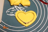 将冷藏变硬的面团取出,擀成约5毫米厚的薄片,用大小桃心模压出形状