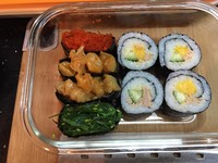 保鲜袋上面铺一张烤海苔。比较光滑的一面朝下。海苔每一次拿出来就要马上把口封好,否则很快就受潮不脆了,包装没有自带密封条的就整袋放入密实袋里密封。一般一杯米煮出来的饭可以做两卷寿司,铺得薄时还有多,所以一杯米最少要用两片海苔,一杯半就要三张以上,以此类推。