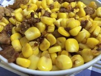 碎肉半熟后,倒入玉米,中火翻炒至熟,出锅前放少量的盐调味。