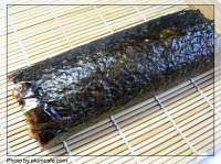 Tip:1)蛋皮的卷法:蛋液加盐调匀。锅热油少许,倒入薄薄一层蛋液,成形后用筷子顺势卷起,成圆筒。我用的是方形锅,圆锅也可,做出来的蛋皮卷如果太长,用刀切成跟海苔同样的长短即可。 2)那五个小圆筒以及蛋皮卷都不要卷太粗,以免最后合起来的时候太粗,用一张完整海苔把它们卷合在一起的时候就会卷不过 来了。如果不小心做得实在太粗,用一张海苔皮实在难以卷住它们的话,也不能功亏一篑地放弃,可以在“缺口”处添一层寿司米,然后剪一块跟缺口大小差不多的