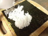 把紫菜放木卷里,上面放饭,压平。