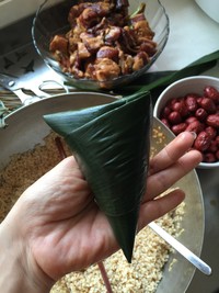 顺着三角的边将所有的粽叶都折好