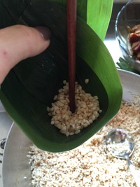在漏斗中舀入糯米,拿筷子捅实