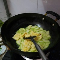 揭锅,西葫芦变软后倒入鸡蛋,继续翻炒,撒葱花盛出
