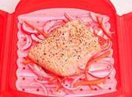 将装好三文鱼的乐葵盒子烤盘中,放入预热好的烤箱中层,用180度的温度,中层,烤约10-15分钟。(根据鱼肉大小决定时间及自己喜欢滴火候)