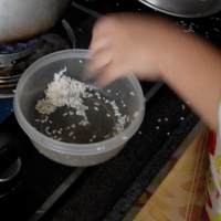 头天晚上将一杯大米淘洗干净,放入冰箱冷冻室冷冻。