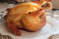 烤箱预热200度,放入烤叉,底部垫一个烤盘,接住滴落的油脂,上下火烘烤1个小时左右,中间每隔15-20分钟可用刷子,在鸡身表面刷些蜂蜜水