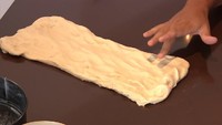 将发酵好的面团放在撒了面粉的案板上,用手指按压延展面团,使其成为一个50X20cm的长方形。