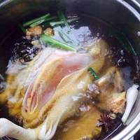 鸡烫后马上放入刚刚准备的冷水里静泡两分钟,让鸡全凉!这两步是为了让鸡皮收紧!在煮时皮不会破开。