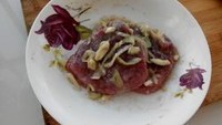 牛里脊用刀背拍一拍(我是买肉时直接让卖肉的切好两片),切葱花,姜切丝,蒜拍散切几下。