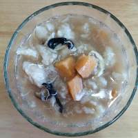 红心红薯切小块,水发木耳切细丝,土鸡蛋打入碗中,鲜蒜切薄片,面粉盛入小盆待用。