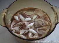 重新烧一锅水,放肥肠、盐、姜片、料酒、八角、香叶、料酒,煮30分钟,沥干水分备用