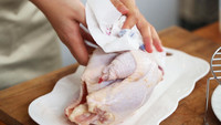 红糖酱油制作好之后,就可以把用盐水泡好的整鸡取出上料啦! 首先从盐水中取出鸡,用纸巾擦干