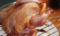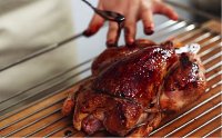 再刷一层红酱油,鸡胸朝上,把温度计的针插进鸡胸里,然后送进预热到95度的烤箱。 *烤的过程中,视鸡皮的上色情况可以补刷2到3次红酱油。这样烤出来的鸡皮颜色会更红亮。 *每家烤箱的实际温度和鸡的大小都不一样,所以时间也会有所差别,一个大概的时间是2个半小时。