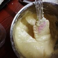 蛋黄糊中加入1/3蛋白切拌均匀,然后倒入蛋白盆,充分切拌翻拌均匀,这个速度要快。(具体的做法是沿着搅拌盆的侧面,像要刮东西般迅速地舀起面糊,绕一周后,让面糊掉落在搅拌盆的正中央,再纵向像切东西般的混合。建议多看视频练习,避免搅拌过程中消泡)