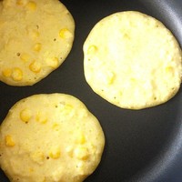 将三勺面糊分别倒入刷了薄油的不粘锅的三个方位。开大火煎至变色,然后调小火,翻面再煎40秒即可,将煎好的玉米饼放置在烧烤架上晾凉。