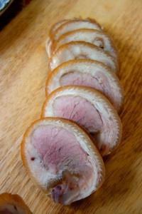 案板上铺一张寿司帘子,再铺上保鲜膜。肉皮在下,从一端开始,像卷寿司一样把肉卷起来。为了做出来的肘花漂亮,应该尽可能的一边卷一边用帘子压实并收紧肉卷儿。完成后,剪断保鲜膜。这时的肉卷儿里面会有一些汤汁,不会很结实,趁这时,隔着保鲜膜把肘花稍微再整理一下,尽量让肉皮包裹着所有的肉。