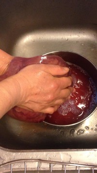 使得猪肝膨大,再将血水挤出。反复进行3次