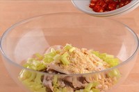 然后将花生末、蒜泥、芹菜段倒进盛有猪耳朵的碗里。