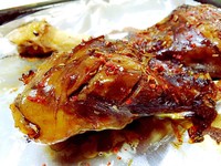 出炉前五分钟拿出烤盘,撒辣椒粉,刷蜂蜜水,到点后取出即可。烤好后的羊腿外酥里嫩,香糯可口。