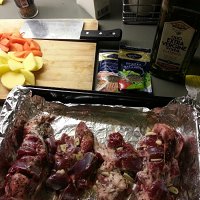 羊腿洗净擦干,用刀横向每隔2-3厘米划开,腿部肉厚的地方切断大块肉也划条。肉块和羊腿棒正反面抹盐罗勒粉孜然粉,然后给它们略做按摩,蒜片塞到划开的肉之间,正面刷上一点橄榄油。腌制3至6小时,烤箱烧烤模式预热250度,烤20分钟。(如果没有烧烤模式用单面火),在羊腿上洒些水,目的是让羊腿不要太干,加上后面要戳汁出来烤土豆。
