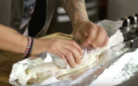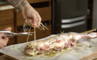 他用了一张烘焙纸铺在羊腿上顺着纸把羊肉卷起来,就像卷寿司!