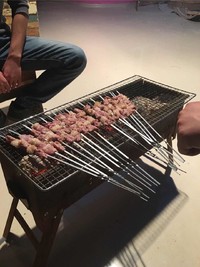 然后男人生火,提前生火让煤着透了没有明火。这样烤出的肉能迅速熟还不会烤焦。女人搬个小板凳开始穿肉。一块瘦肉一块肥肉一块瘦肉一块肥肉一块瘦肉。一个签字穿三瘦两肥交叉开来放一边。肉平铺到烤肉槽子上,不要太多串不好掌握。正面反面来回烤,有明火了赶紧把肉拿开。烤到肉变白肥肉出油有点变小有点焦黄了就撒料料撒不匀的话肉和肉之间互相沾着匀一匀。调料(孜然、辣椒、盐)肉快熟的时候撒料盐—辣椒—孜然。赶紧趁热吃吧。如果有馕加工个馕烤肉的时候盖肉上加热,把肉串上的油沾馕上。撒点料。馕里加串肉。滋滋滋冒着热气和油脂。或者蒸锅抓饭。也是配。或者烤两个馍片,馒头切片抹油烤黄撒点料再带份凉皮子。再活着羊汤一锅配…………
