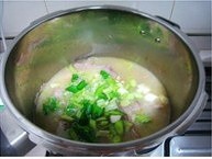 翻开盖,下蒜段、芹菜,加盐、鸡精、白胡椒